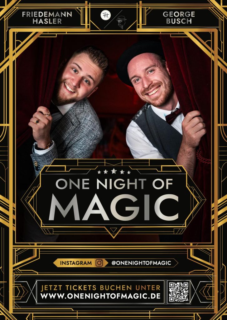 Zwei Zauberer, eine Idee. Ein Abendprogramm mit fesselndem roten Faden. Die beiden Zauberer George Busch und Friedemann Hasler sind seit vielen Jahren auf Münchens großen und vor allem kleinen Bühnen unterwegs. „One Night Of Magic“ ist an jeder der ausgewählten Locations immer nur einmal zu erleben. In diesem gemeinsamen Debüt-Programm erzählen die beiden vom Heranwachsen, dem ersten Date, dem Zusammenleben mit geliebten Menschen, vom Kinder bekommen und vom unendlichen älter werden. Das Publikum ist mit einbezogen und wird zum aktiven Teil eines einmaligen Abends.
